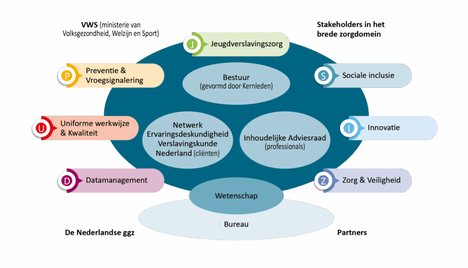 We werken ook nauw samen met de Nederlandse ggz: de brancheorganisatie voor de geestelijke gezondheidszorg. Op die manier versterken we elkaar op gemeenschappelijke thema’s, zoals het Waardenetwerk Verslaving en gezonde leefstijl.