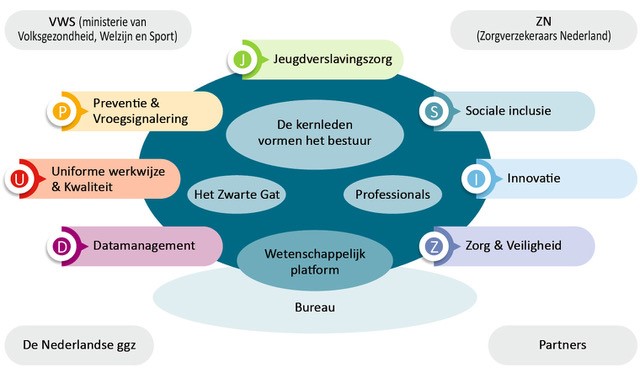 We werken ook nauw samen met de Nederlandse ggz: de brancheorganisatie voor de geestelijke gezondheidszorg. Op die manier versterken we elkaar op gemeenschappelijke thema’s, zoals het Waardenetwerk Verslaving en gezonde leefstijl.